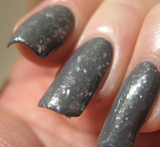 I love this polish which is nice because it wasn't easy to find. I found two displays and it was gone in each one. I finally found it hidden in a Revlon display. Silly people! Like I wouldn't find it there? The nail polish sense is strong within me. This is a really good dupe to CND Sugar Sparkle which I'll show you in another post.This is one coat over a grey creme.